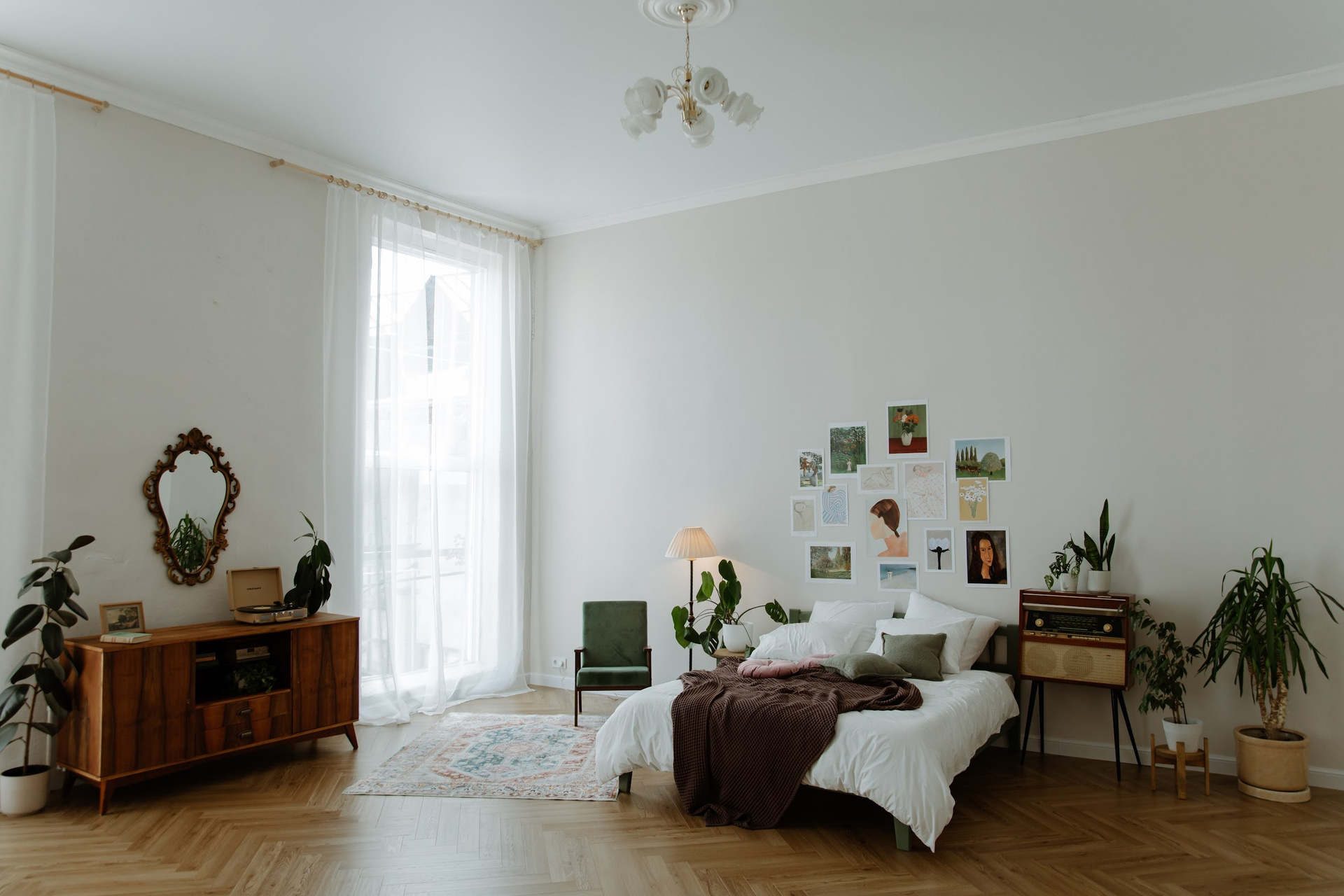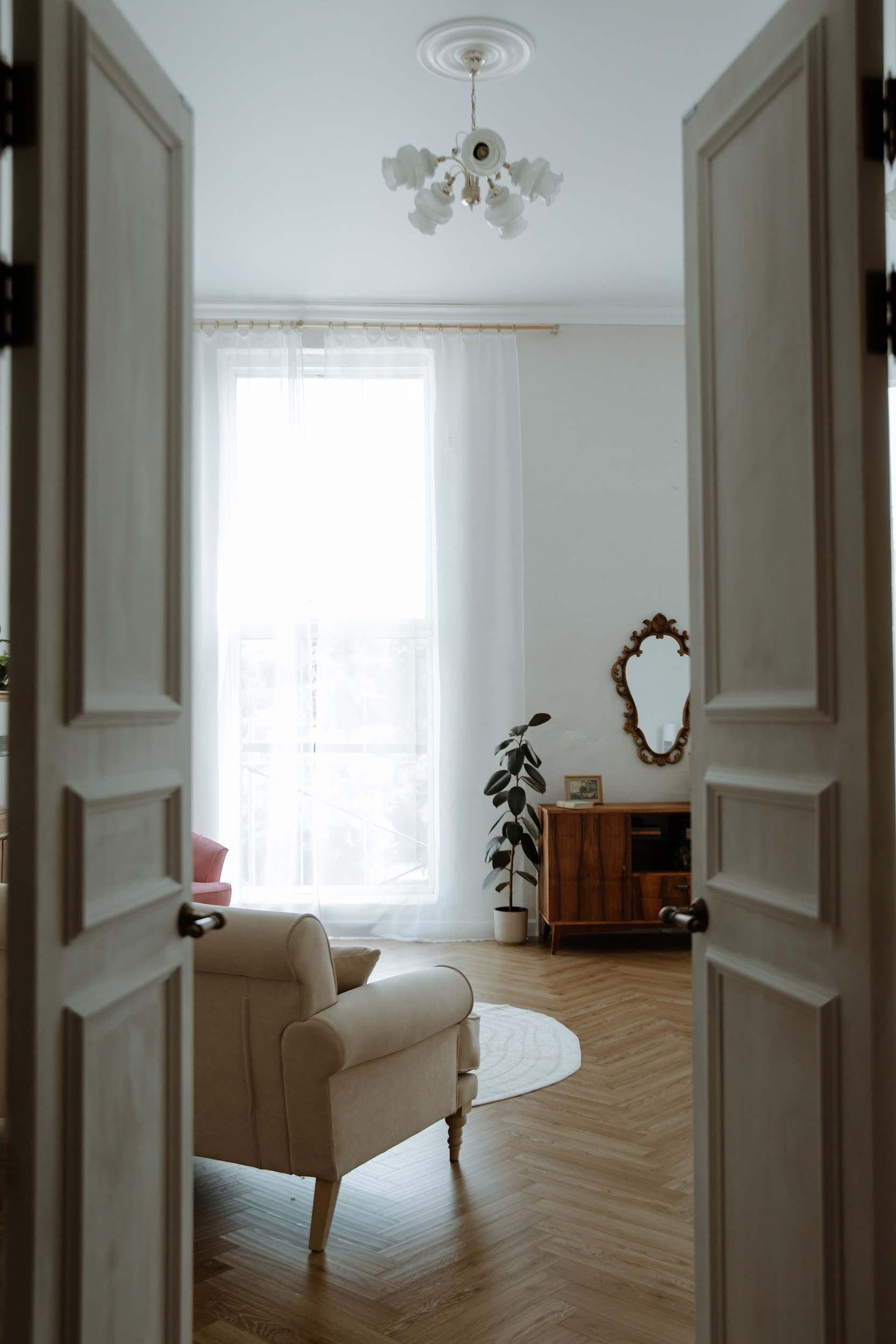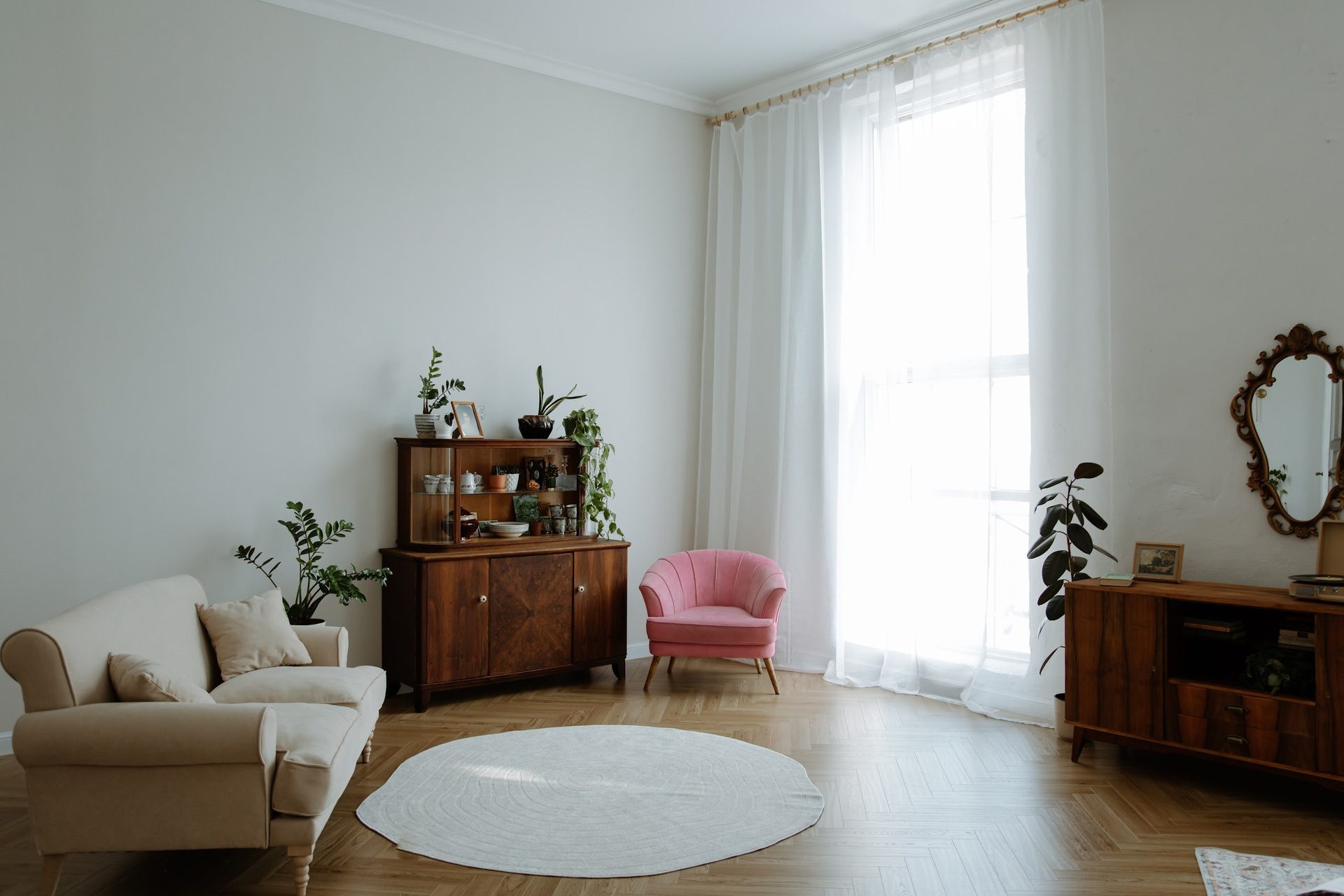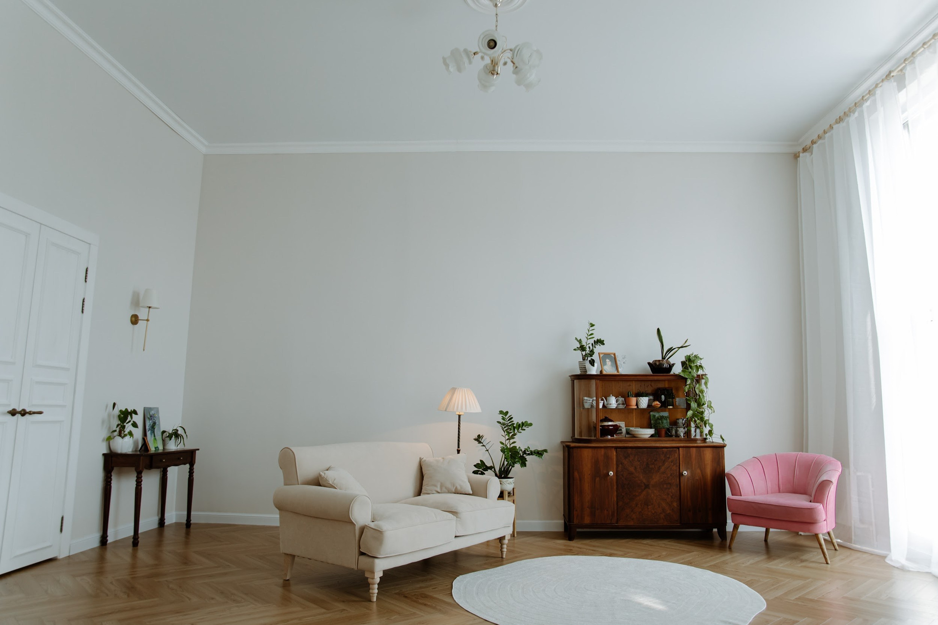 высота потолков в этом зале 4 метра, огромные окна в пол, красивый пол ёлочкой, винтажная мебель и огромное количество живых цветов