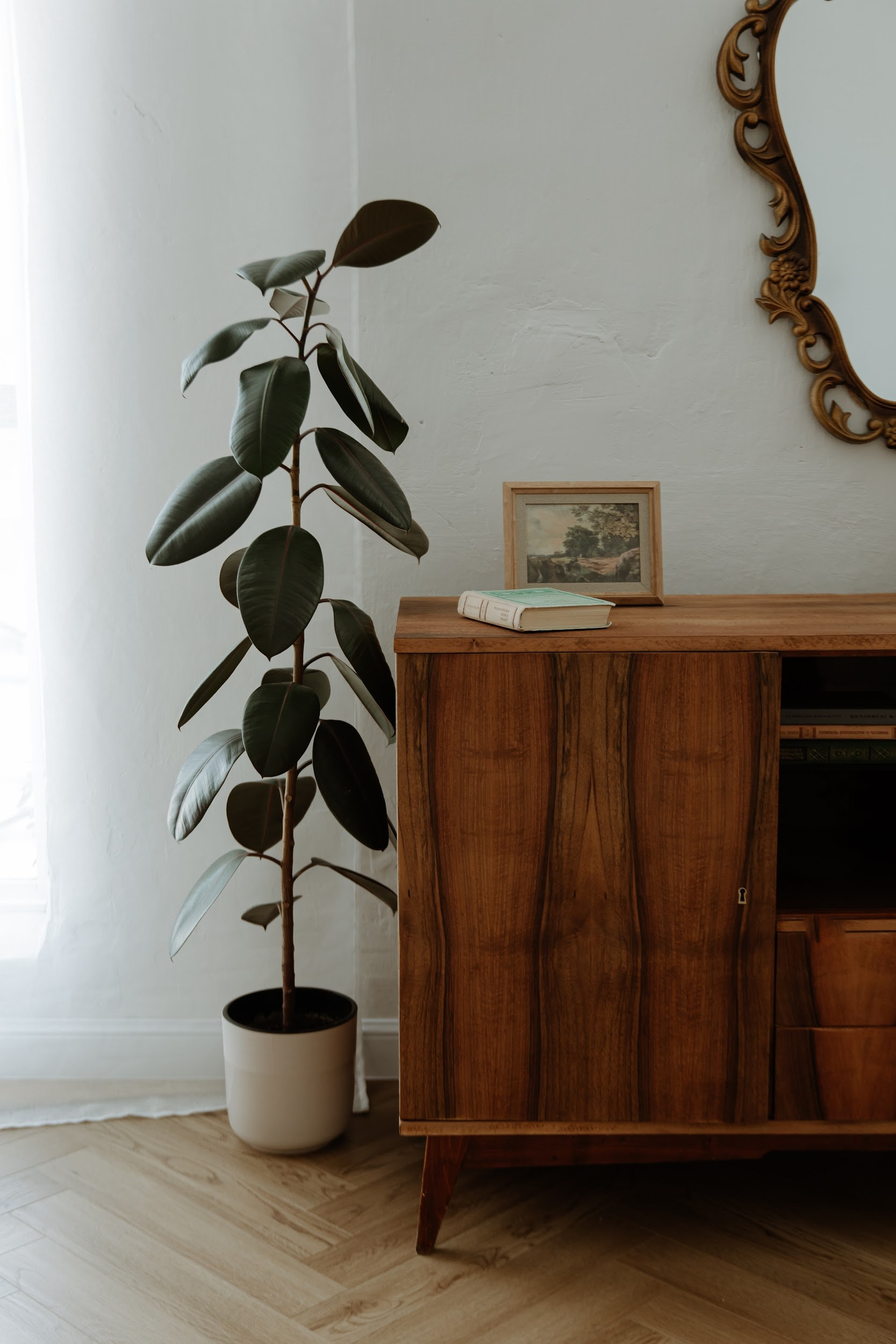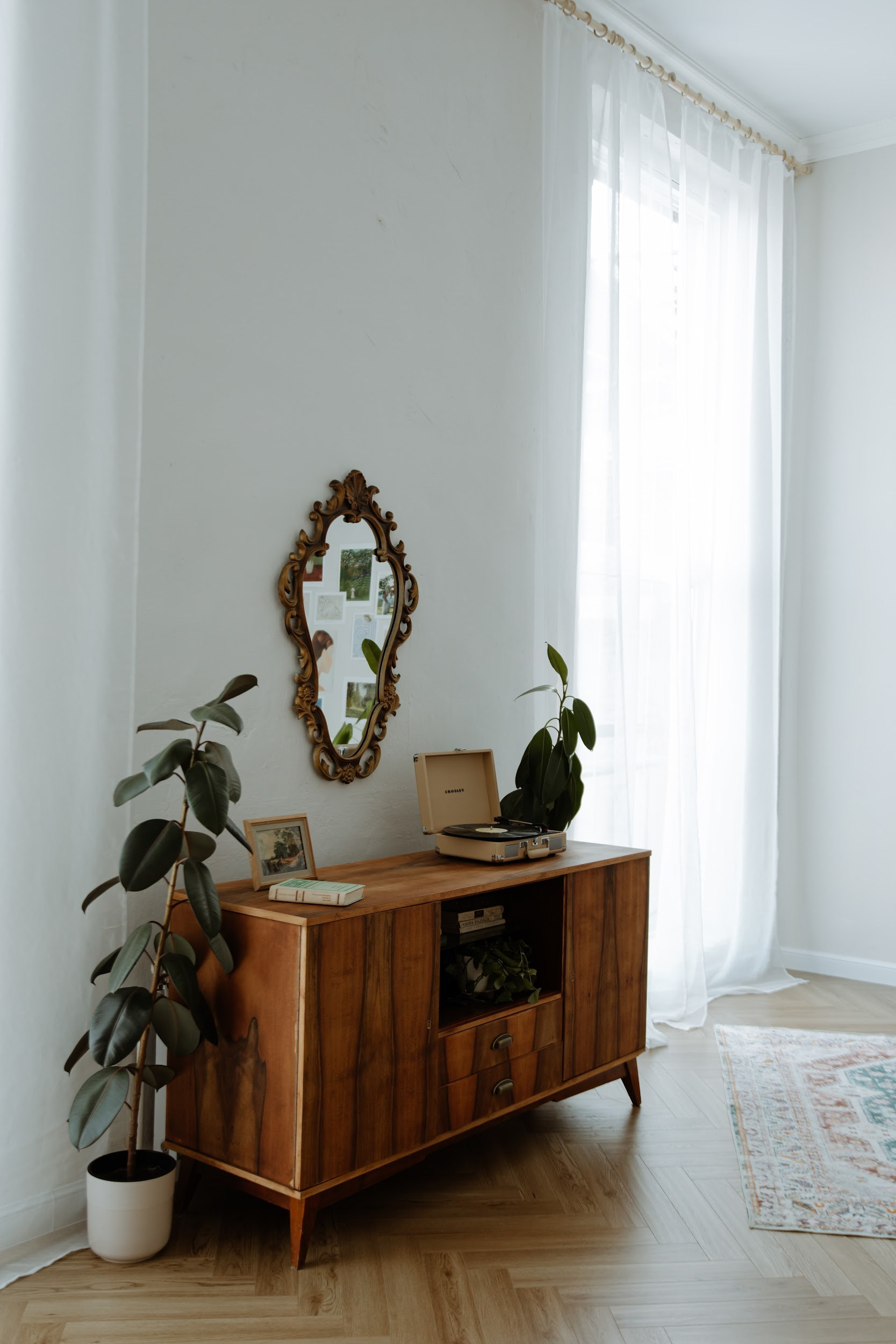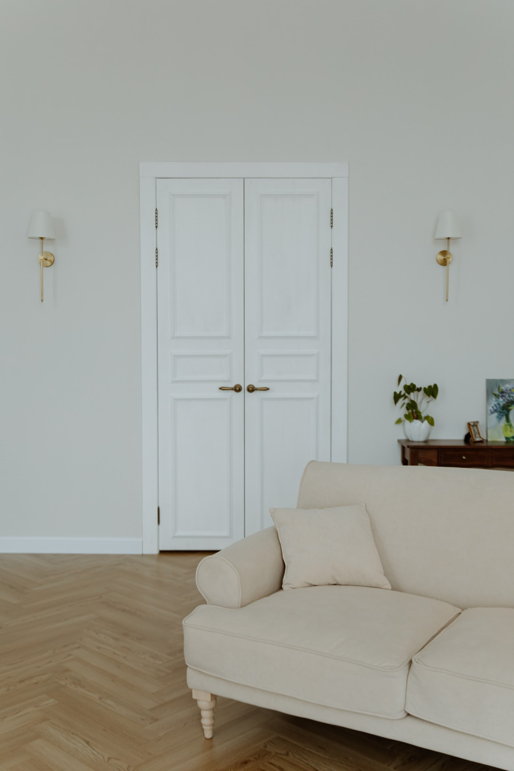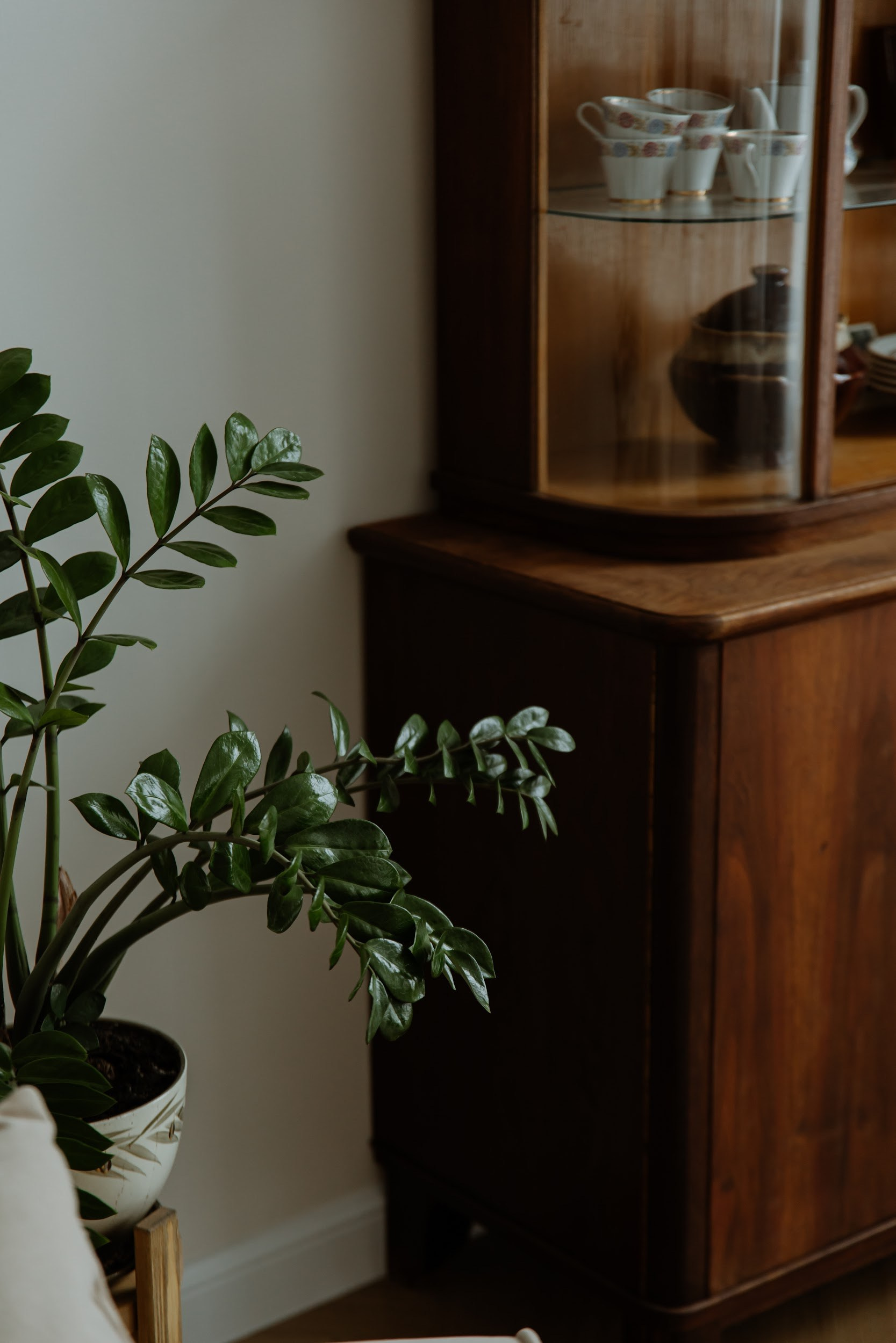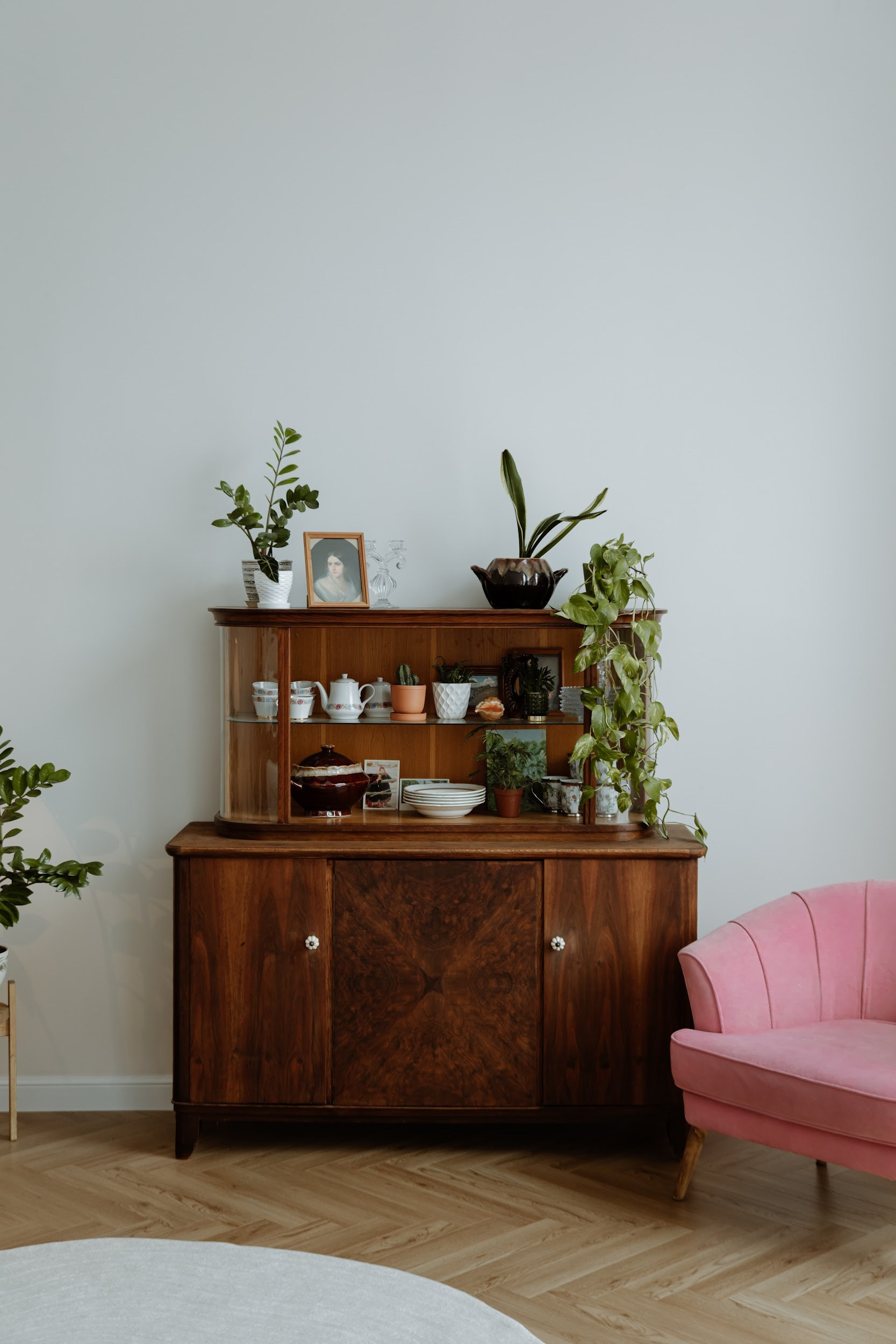 высота потолков в этом зале 4 метра, огромные окна в пол, красивый пол ёлочкой, винтажная мебель и огромное количество живых цветов